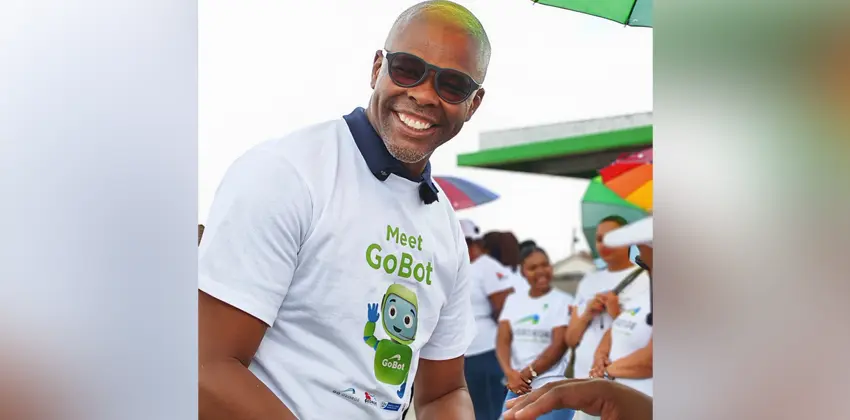 The Western Cape Minister of Mobility, Isaac Sileko, wearing a T-shirt that reads: Meet GoBot, with a picture of the GO GEORGE chat bot.